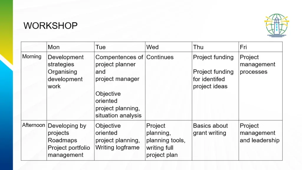 - Interactive and participatory working methods will be applied in the execution of the training program and workshop.